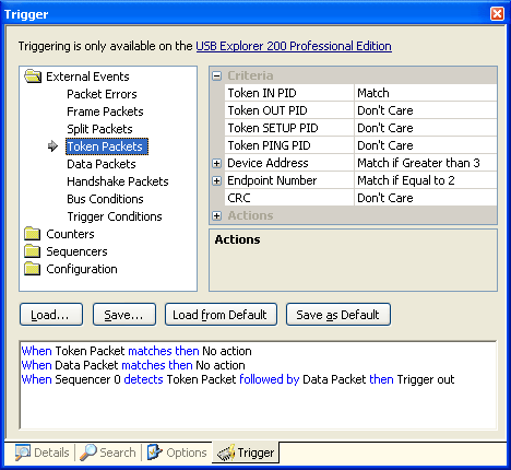 The USB Explorer 200 Professional Edition is equipped with a powerful and adjustable hardware trigger. It permits the triggering of specific actions when external events are occuring, when repetitive events take place or when specific event sequences are happening. The user interface handling is very swift. A text mode summary gives a glimpse of events and defined actions.
