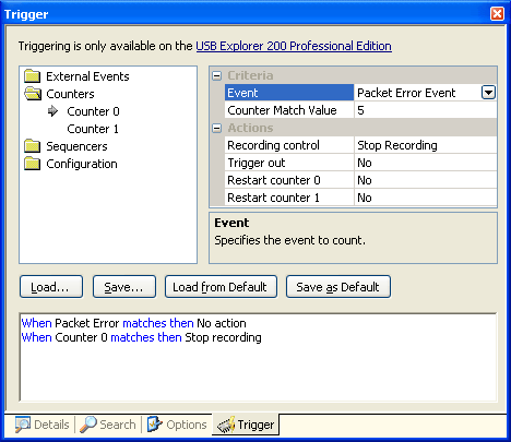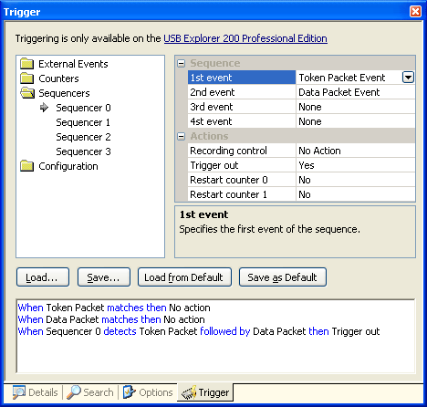 The USB Explorer 200 Professional Edition is equipped with a powerful and adjustable hardware trigger. It permits the triggering of specific actions when external events are occuring, when repetitive events take place or when specific event sequences are happening. The user interface handling is very swift. A text mode summary gives a glimpse of events and defined actions.